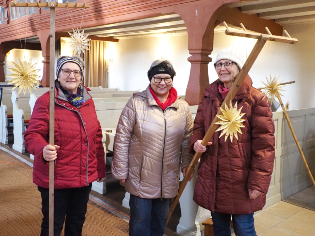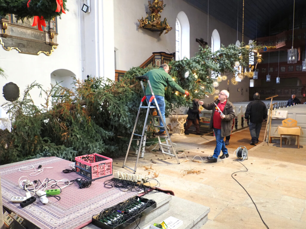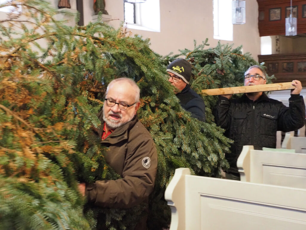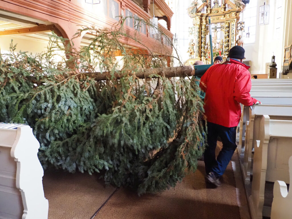 4. Adventssamstag, 9.00 Uhr: Der am Vorabend gefällte Baum fährt vor und wird in die Kirche gefädelt. Das ist immer ein Kraftakt und eine Geschicklichkeitsübung, damit das gewaltige Gewächs nichts beschädigt. Der Taufstein ist dieses Jahr jedenfalls nicht mehr im Weg…
